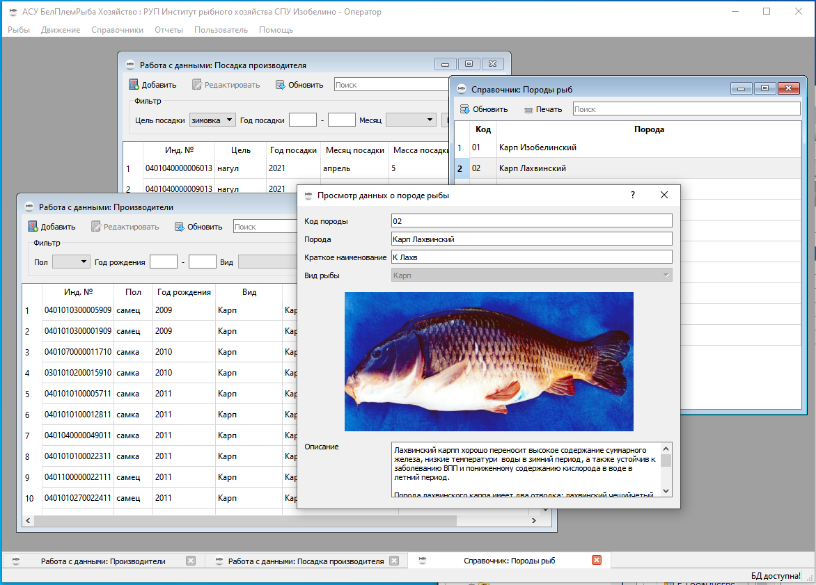 The information system is an interface for working with the database on tribal fish farming. The main users of the system are the staff of the Ministry of Agriculture and Food Industry, the Russian State Unitary Enterprise "Institute of Fishery" and breeding fish farming organizations.