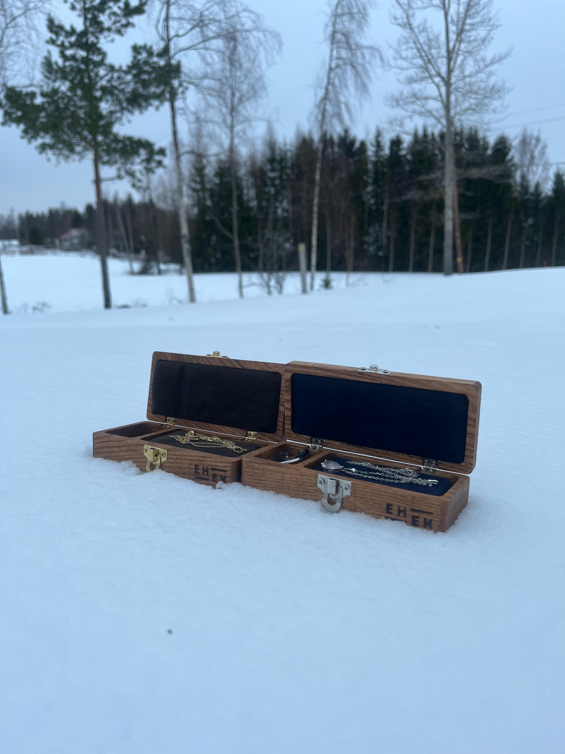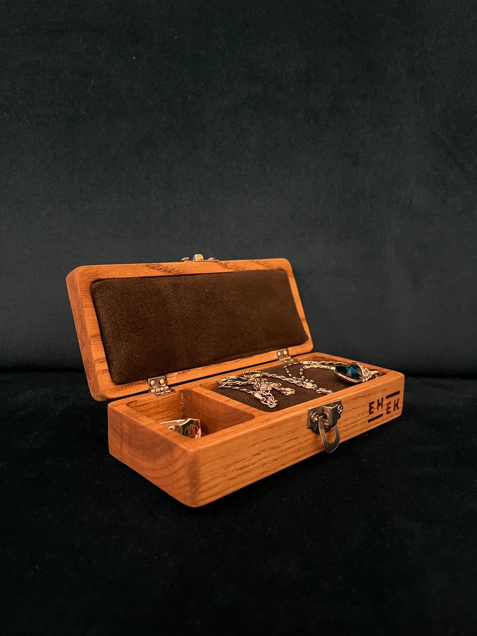Dessa bärbara smyckeskrin är handgjorda av estniskt askträ och håller dina smycken trasselfria. Produkten är miljövänlig eftersom trä- och tygavfall används och askarna tillverkas i Estland.